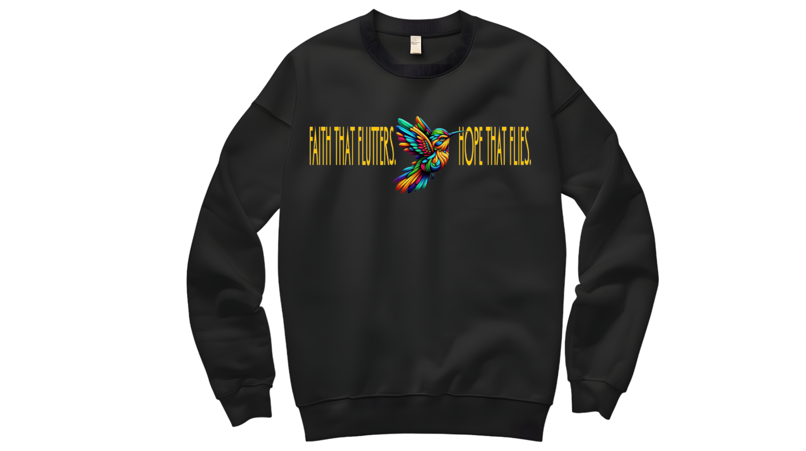 Wrap yourself in warmth, color, and inspiration. The Faith That Flutters crewneck sweatshirt brings a bold, uplifting look with its bright, multicolor hummingbird design — a symbol of joy, renewal, and faith in motion.